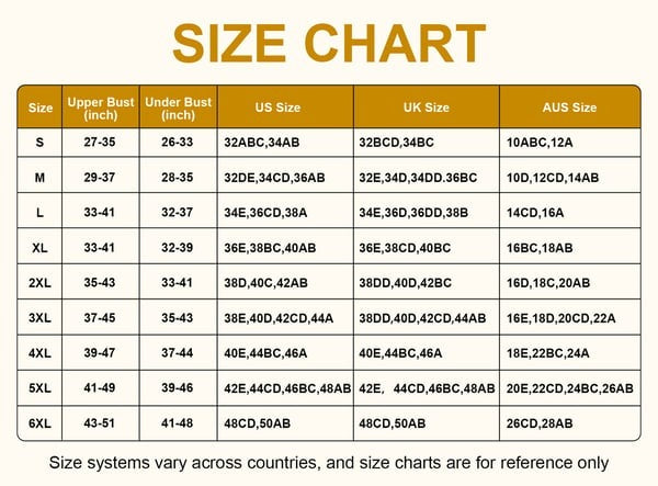 | Size | Upper Bust (inch) | Under Bust (inch) | UK Size | AUS Size |
